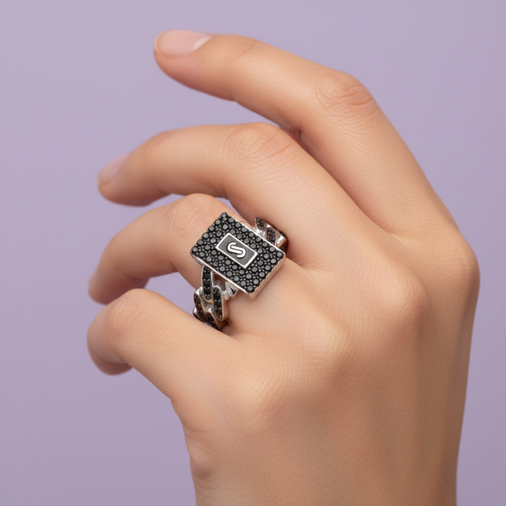 Anillo de Plata .925 Eslabones con Placa de Zirconias Negras Brillantes mod. 1401