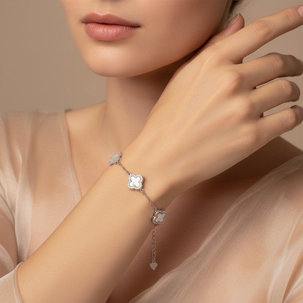 Pulsera de Plata .925 Diseño de Trébol Incrustado de Madre Perla. 1469