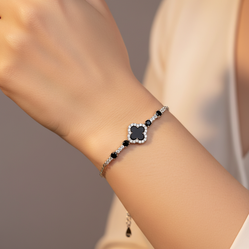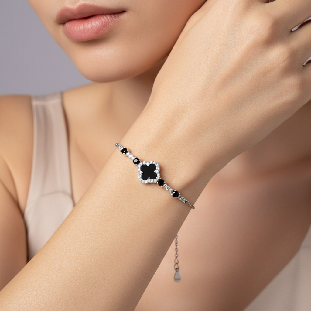 Pulsera de Plata .925 Diseño de Trébol Incrustado de Ónix. 1465